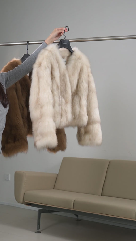 "Champagne on a Snowy Night" imported fox fur two-tone V-neck oblique stripe slim jacket