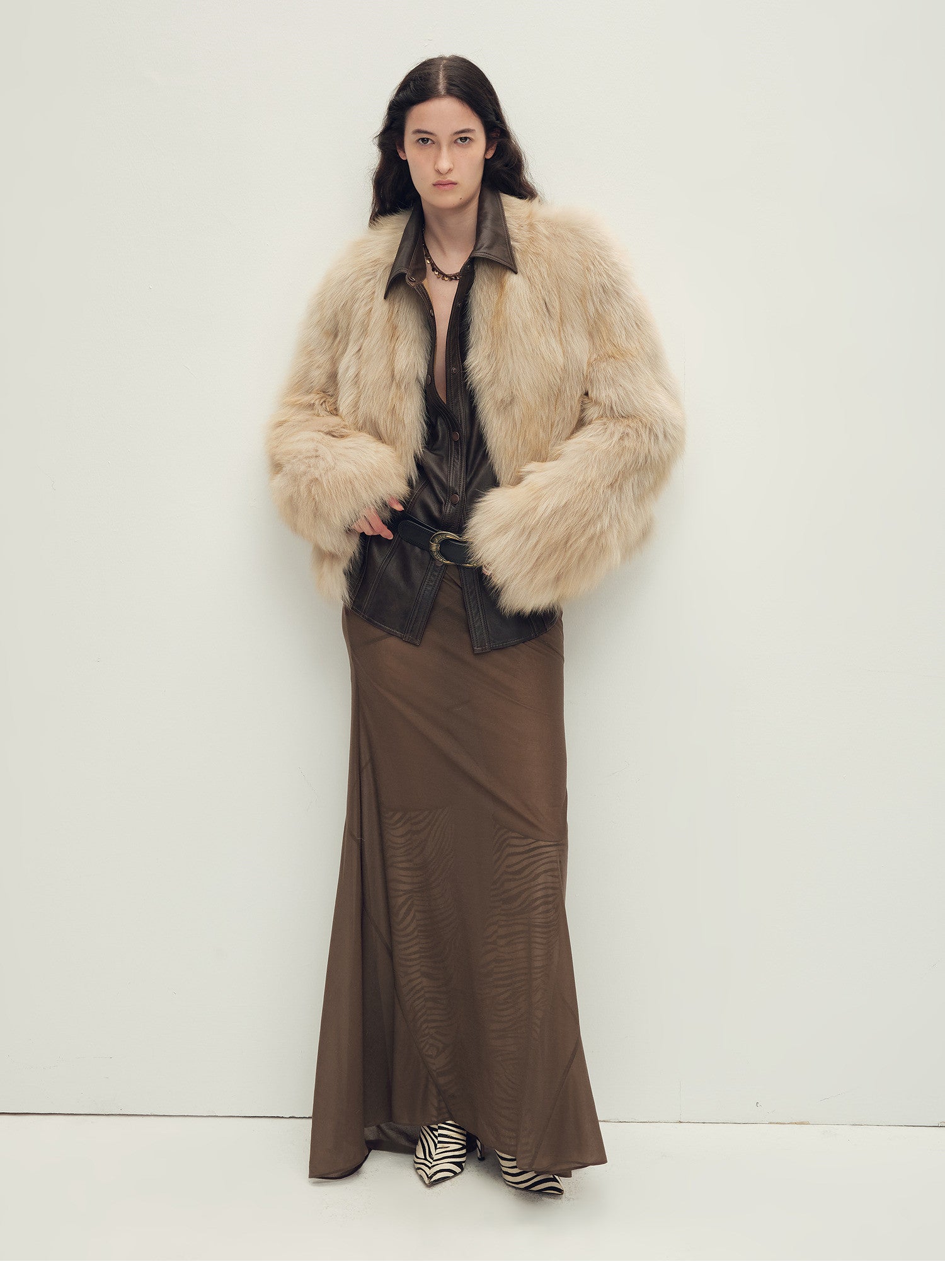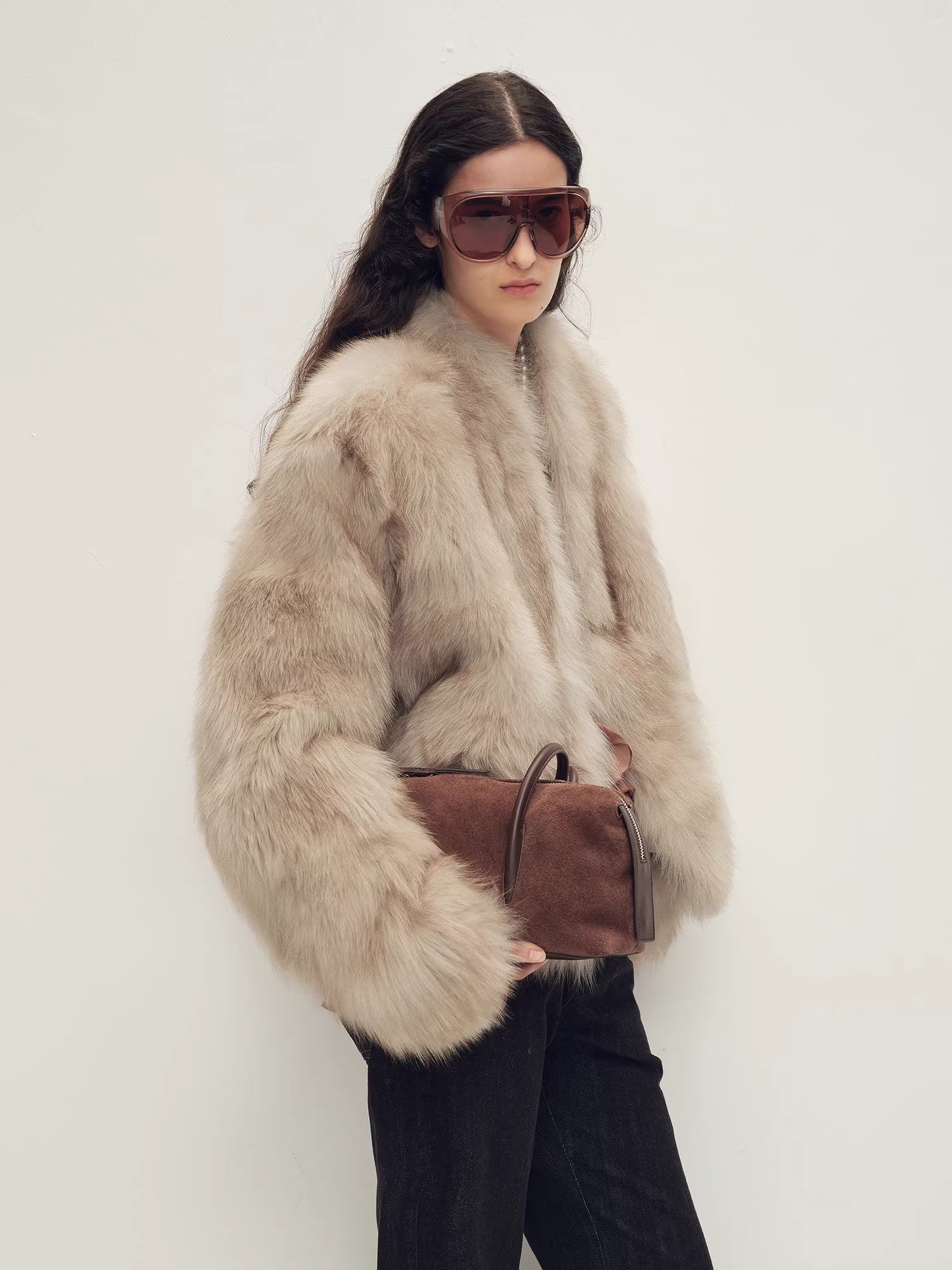 This relaxed oversized coat is crafted from premium Sagafurs Crown-grade fox fur in a soft ombré finish. Featuring a short, boxy cut with a standing collar, it elongates your silhouette while offering effortless comfort. Perfect for deep winter layering—stylish, warm, and never bulky.