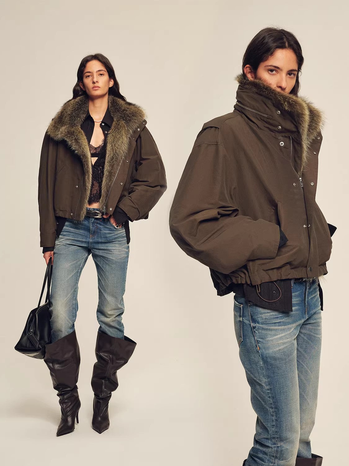 Triple Luxury Fur Collar: Detachable North American Raccoon, Coyote, and Italian Tuscan lamb fur collar with natural two-tone gradient—ultra-dense undercoat locks in heat while adding sophisticated texture and wild elegance to any outfit